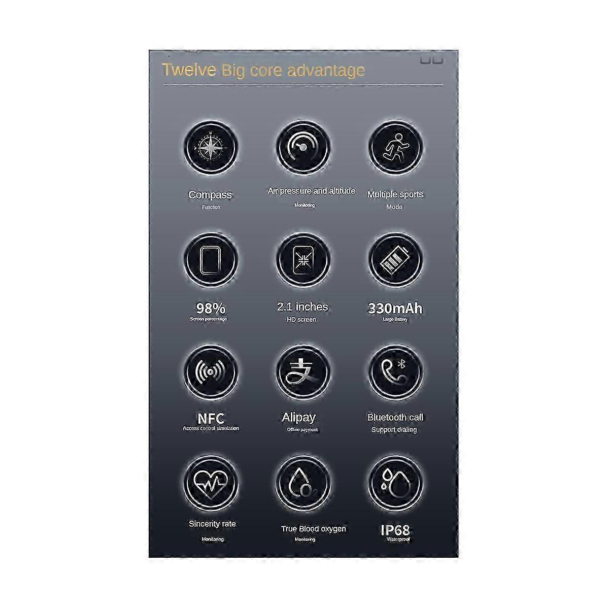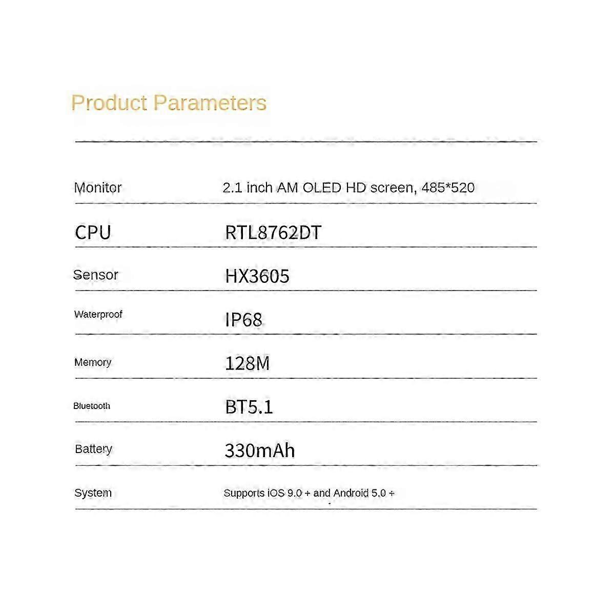 1.2.1 inch HD Full Touch Round Screen,Resolution up to 485 * 520px,The picture is clear.2.NFC access control identification, which only requires the equipment to be close to, wake up and identify in . Easy to open, more efficient3.Heart rate monitoring,Blood oxygen monitoring,Sleep monitoring,Blood pressure, sedentary reminders, water intake reminders, syphilis, respiratory training.4.Custom screen page,And dozens of page ,There is always one 5.GPS motion trajectory synchronization. You can turn on map navigation on your watchMultiple functions for outdoor activities:Compass mode for directional recognition, altitude monitoring, and air pressure monitoring! There is also an emergency SOS function! the safety of outdoor activities! Experience a different adventure! The watch comes with 96 sports modes!Display : 485 * 520 pixelsBluetooth Version: Bluetooth 5.1: support Android 5.0 system and IOS 9.0 aboveCharging : Magnetic suction wireless charging fast charging (150MA/hour)Silicone strap: 22mm width, total length 256mm, adjustable range 175-260mmMemory:RAM:(192KB) / ROM:128MWatch Size : Diameter 43.5MM/Thickness 14MMWatch Weight (With silicone strap) :200gBattery :330mAh High Density Lithium-ion BatteryAPP Name: RDFitwatch case Colour:SilverMaterial:Silica gelPackage Contents:1 x Watch1 x Charging cable2 x StrapOnly the above package content, other products are not included.Note: Light reflection and different displays may cause the color of the item in the picture a little different from the real thing. The measurement allowed error is +/- 1-3cm.