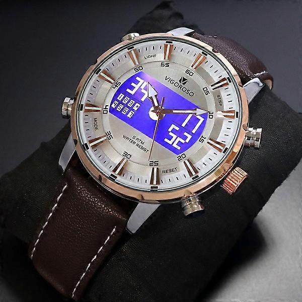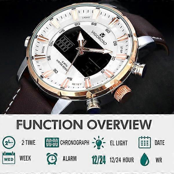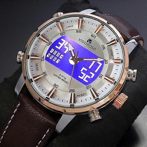 VIGOROSO Mens Analog Digital Sport Watches New Fashion Multi-function Alarm Stopwatch LED Backlight Leather Strap Water Resistant Wristwatch