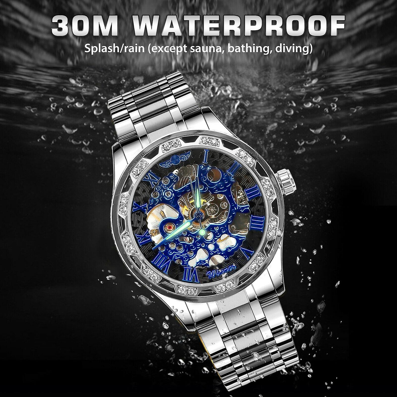 Luxury Men's Automatic Mechanical Stainless Steel Watch Diamond Hollow Skeleton