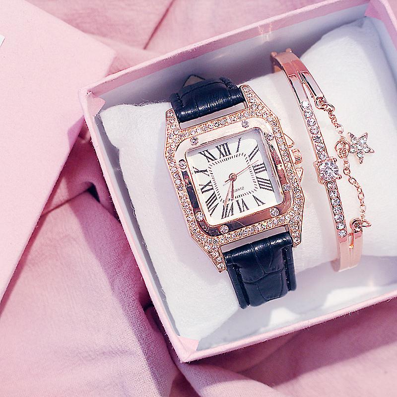 Women Fashion Leather Strap Square Diamond Quartz Wrist Bracelet Watch Gift Set