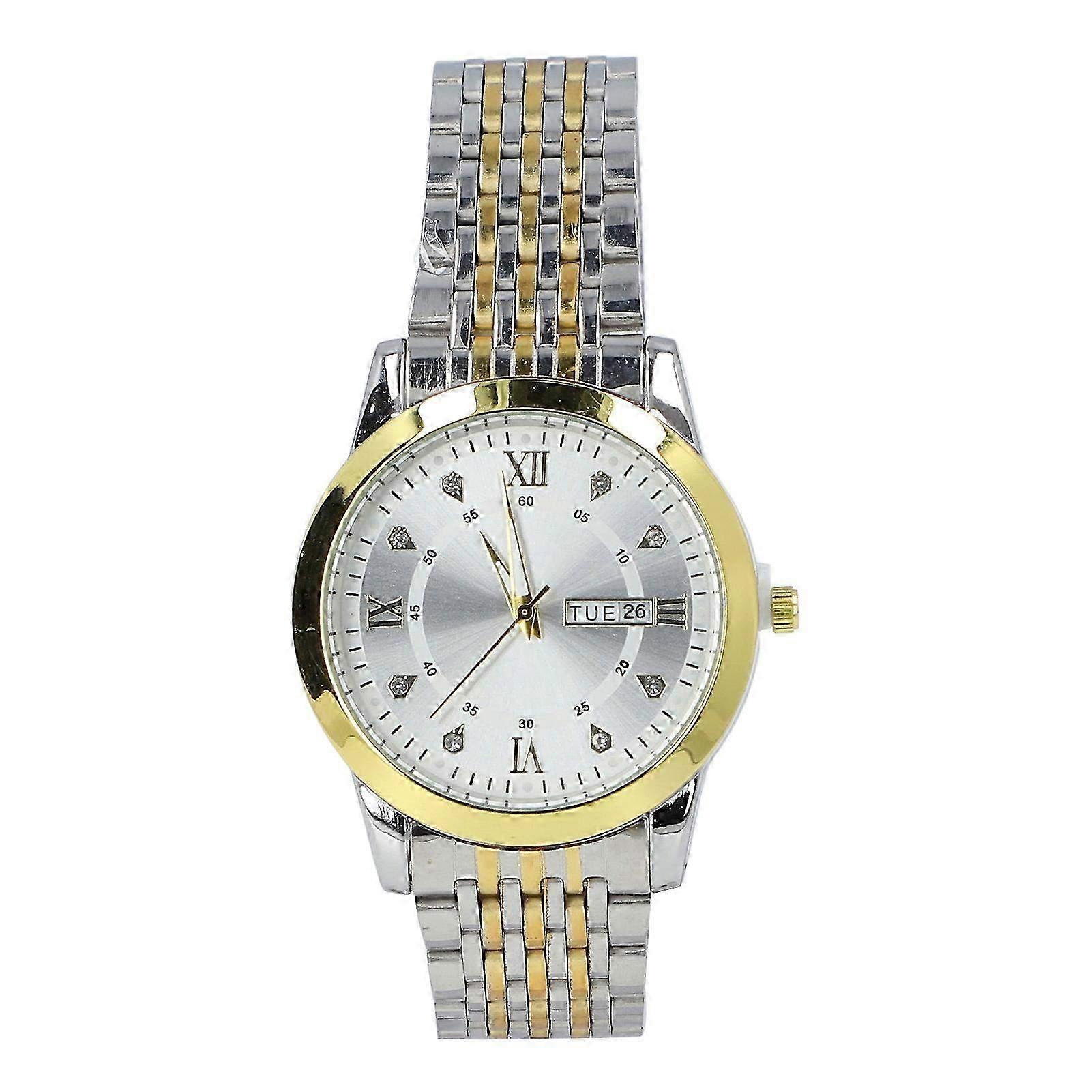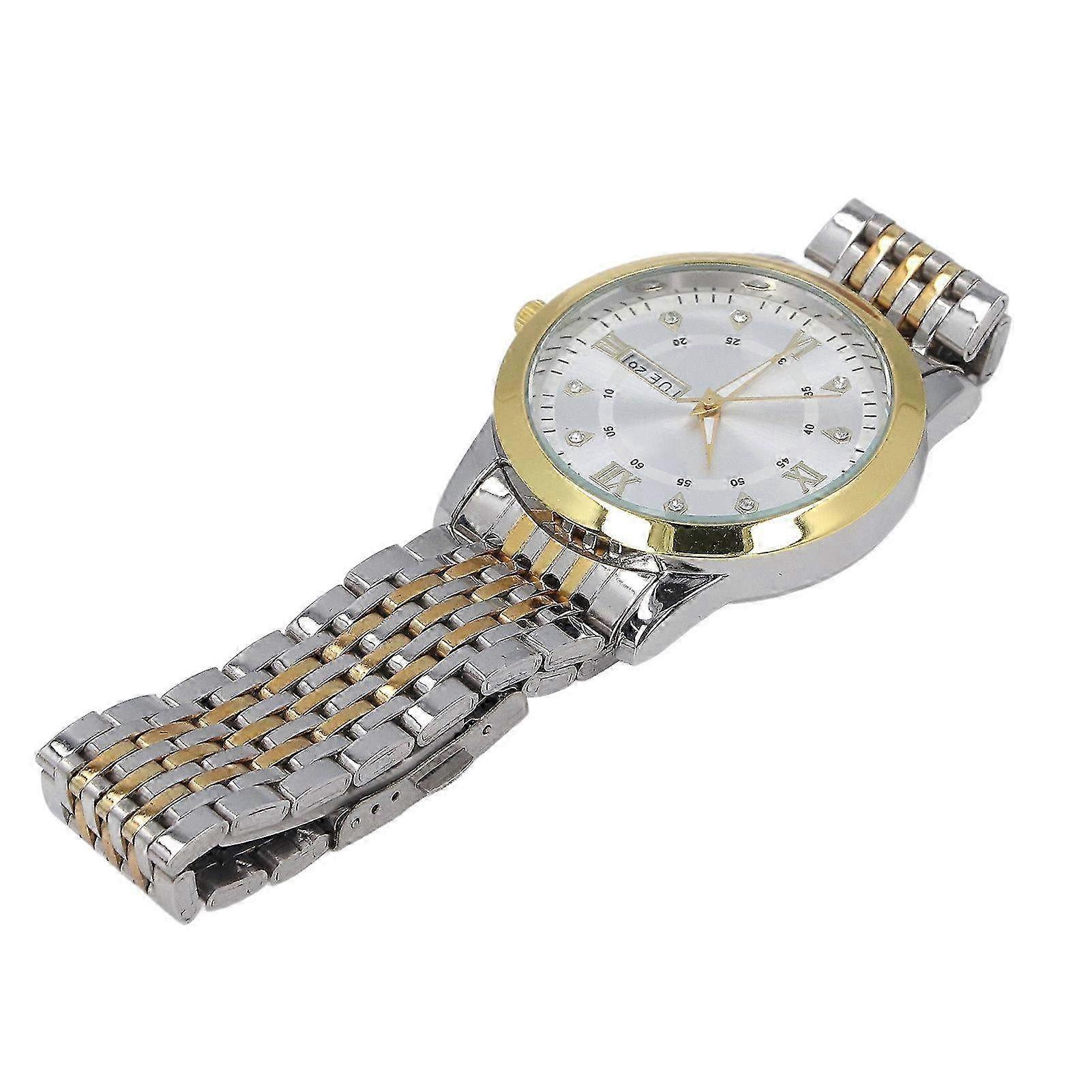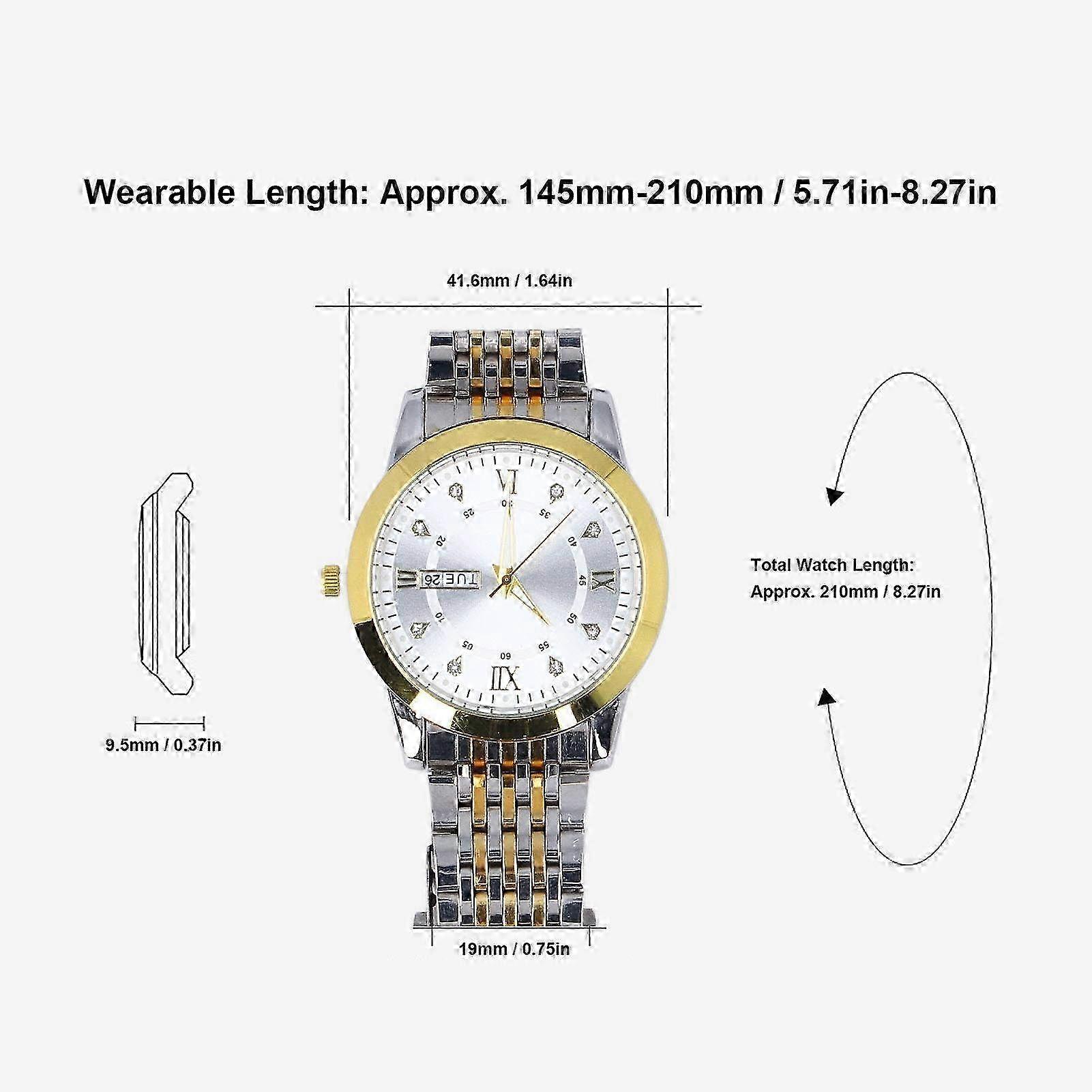 Business Dress Men Watch Quartz Luminous Date Calendar Chronograph Casual Daily Wrist Watch for Men White Dial Item Type: Men Business Quartz Watch Material: Alloy, Stainless Steel, Glass Bracelet Material: Alloy Case Material: Alloy Back Cover Material: Stainless Steel Mirror Material: Mineral Glass Dial Thickness: Approx. 9.5mm / 0.37in (The product size is measured manually, there will be 0-1mm error) Dial Width: Approx. 41.6mm / 1.64in Bracelet Width: Approx. 19mm / 0.75in Total Watch Length: Approx. 210mm / 8.27in Wearable Length: Approx. 145mm-210mm / 5.71in-8.27in Battery Model: AG10 (with built in battery) Battery Type: Button Cell Battery Capacity: 70mAh